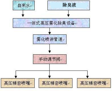第一步:通過將高壓霧化除臭裝置內(nèi)的除臭液經(jīng)無動(dòng)力稀釋比例泵,按設(shè)置的比例調(diào)配成稀釋液;稀釋液經(jīng)膜過濾裝置后進(jìn)入高壓柱塞泵;